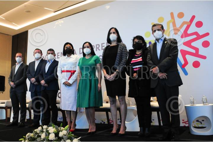 Los alcaldes electos Alfa González, Margarita Saldaña, Sandra Cuevas, Adrián Rubalcava, Santiago Taboada, Lía Limón, Giovanni Gutiérrez, durante la presentación del programa de trabajo de la Unión de Alcaldías de la Ciudad de México (UNACDMX).
