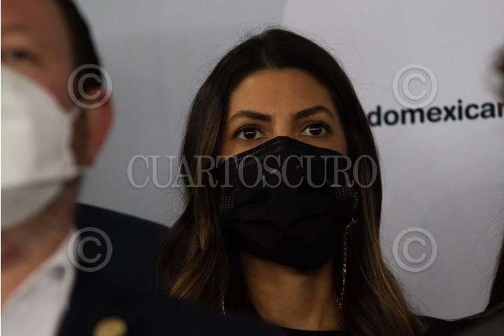Los alcaldes electos Luis Gerardo Quijano, Adrián Rubalcava, Lía Limón, Santiago Taboada, Giovanni Gutiérrez, y Alfa González, durante la conferencia en el Senado de la República, en donde las bancadas del PAN, PRI y PRI les brindaron su respaldo.