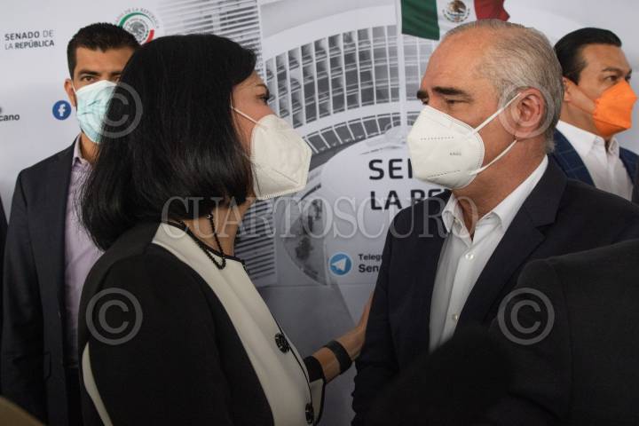 Lía Limón, alcaldesa electa de Álvaro Obregón, conversa con Julen Rementería, coordinador de los senadores panistas, al finalizar el encuentro entre alcaldes de oposición y las bancadas del PRD, PRI y PAN.