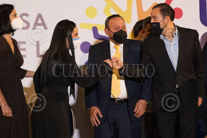 Lía Limón, alcaldesa electa de Álvaro Obregón; Sandra Cuevas, alcaldesa electa de Cuauhtémoc; Jesús Zambrano, dirigente nacional del PRD, y Mauricio Cortés, líder nacional, durante la conferencia de la Unión de Alcaldías de la Ciudad de México.