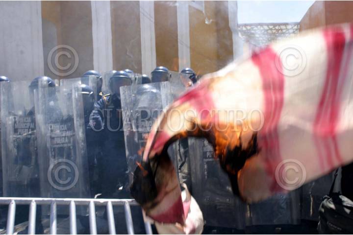 Puebla, Puebla 05 FEBRERO 2004.- Una bandera norteamericana es consumida por el fuego, ante los granaderos, que protegían las instlaciones del centro de convenciones donde se estan llevando los trabajos de viceministros de diversas partes del mundo, para lograr acuerdos del ALCA. FOTO: Moisés Pablo/CUARTOSCURO.COM