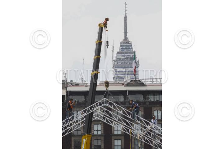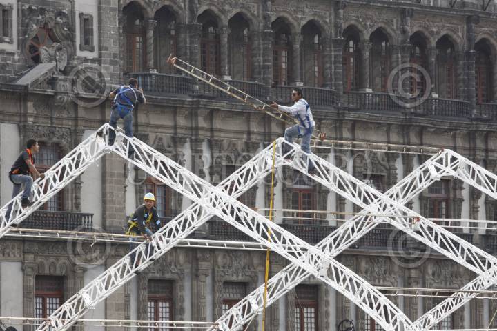 MÉXICO, D.F., 27MARZO2013.- Trabajadores sin medidas de protección, retiran la estructura de la exposición "Aldea Digital" que la empresa Teléfonos de México montó en el zócalo capitalino. FOTO: IVAN STEPHENS /CUARTOSCURO.COM