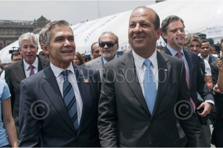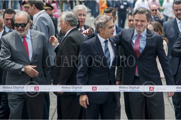 CIUDAD DE MÉXICO, 15JULIO2016.- Miguel Ángel Mancera, jefe de gobierno capitalino; Héctor Slim Seade, director de Telmex; Gerardo Ruiz Esparza, titular de la SCT; el empresario Carlos Slim Helú, y Aurelio Nuño, titular de la SEP, durante la inauguración de la aldea digital en la plancha del zócalo capitalino. FOTO: DIEGO SIMÓN SÁNCHEZ /CUARTOSCURO.COM
