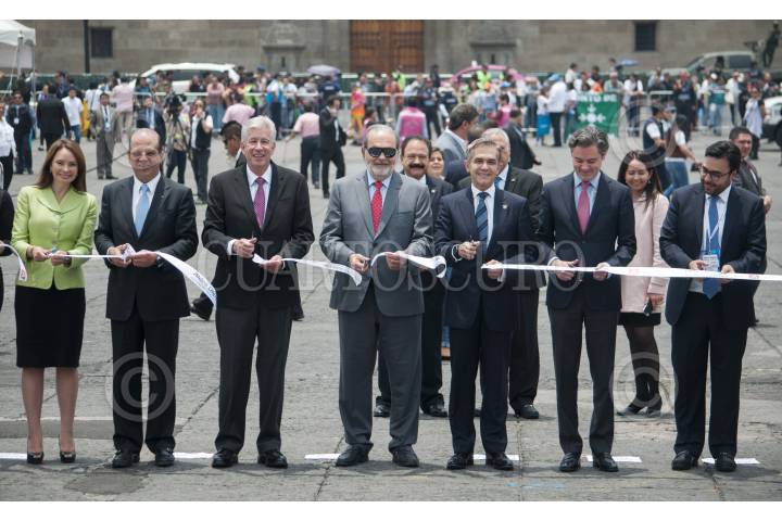 CIUDAD DE MÉXICO, 15JULIO2016.- Rosie Gumataotao Ríos, tesorera de Estados Unidos; Héctor Slim Seade, director de Telmex; Gerardo Ruiz Esparza, titular de la SCT; el empresario Carlos Slim Helú; Miguel Ángel Mancera, jefe de gobierno capitalino; Aurelio Nuño, titular de la SEP, y el comisionado del Instituto Federal de Telecomunicaciones (IFT), Gabriel Contreras Saldívar, durante la inauguración de la aldea digital en la plancha del zócalo capitalino. FOTO: DIEGO SIMÓN SÁNCHEZ /CUARTOSCURO.COM