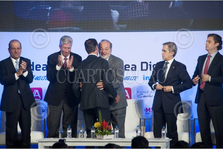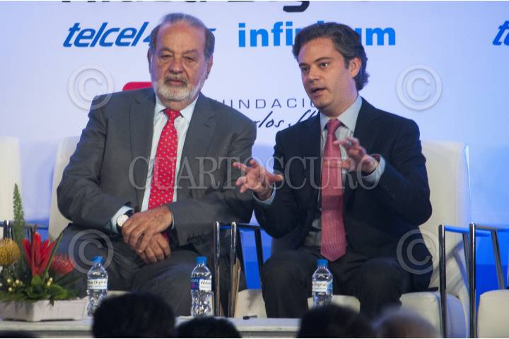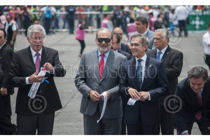 CIUDAD DE MÉXICO, 15JULIO2016.- Héctor Slim Seade, director de Telmex; Gerardo Ruiz Esparza, titular de la SCT; Carlos Slim Domit, presidente del Consejo de Administración de Telmex; el empresario Carlos Slim Helú; Miguel Ángel Mancera, jefe de gobierno capitalino; ; el empresario Carlos Slim Helú, y Aurelio Nuño, titular de la SEP, durante la inauguración de la aldea digital en la plancha del zócalo capitalino. FOTO: DIEGO SIMÓN SÁNCHEZ /CUARTOSCURO.COM