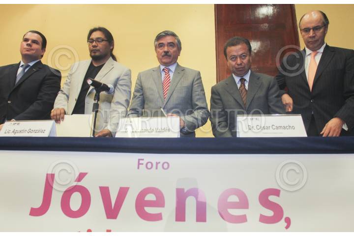 MÉXICO, D.F., 26NOVIEMBRE2012.- Miguel Ángel Carreón, director del Instituto Mexicano de la Juventud, Agustin Gonzalez Director del Instituto Nacional de Investigación Formación en Políticas Públicas y Gobierno, Leonardo Valdez Zurita, consejero presidente del IFE, Cesar Camacho Quiroz, presiente de la Fundación Colosio y Alejandro Chanona, presidente de la Fundación Lázaro Cárdenas durante la inauguración del Foro “Jóvenes, partidos políticos y democracia”. FOTO: SAÚL LÓPEZ /CUARTOSCURO.COM