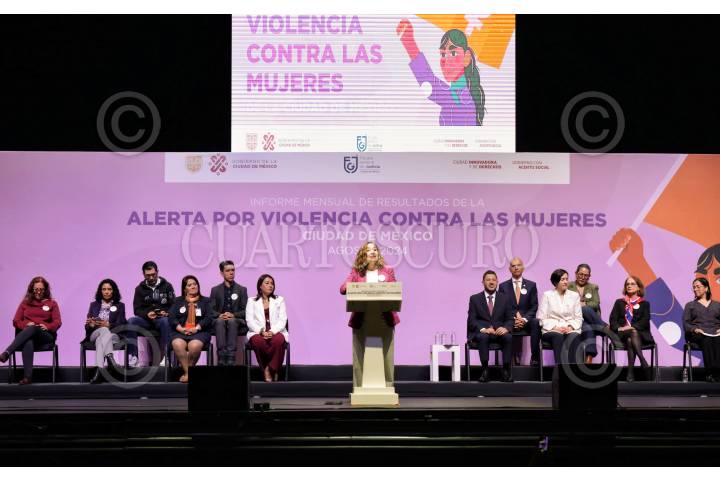 CIUDAD DE MÉXICO, 26AGOSTO2024.- Marcela Figueroa Franco, a Subsecretaría de Desarrollo Institucional de la Secretaría de Seguridad Ciudadana de la Ciudad de México (SSC); Ingrid Gómez, secretaria de la Cultura; Salvador Guerrero Chiprés, presidente del Consejo Ciudadano para la Seguridad y Justicia de la Ciudad de México; Martí Batres Guadarrama, Jefe del Gobierno, y Ulises Lara, Vocero de la FGJCDMX, presidieron el informe mensual de resultados de la Alerta por Violencia contra las Mujeres, que se llevo acabo en el Teatro Metropólitan. FOTO: GOBIERNO DE LA CIUDAD/CUARTOSCURO.COM
