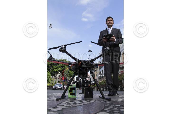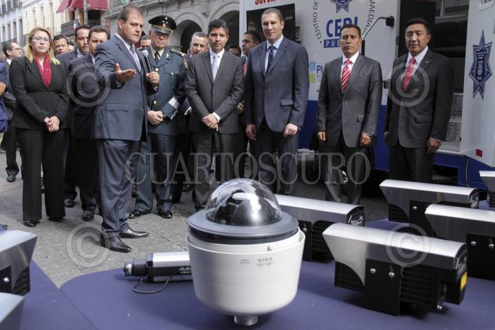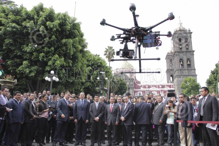 PUEBLA, PUEBLA, 12SEPTIEMBRE2013.- Rafael Moreno Valle, gobernador del estado, signó un Convenio de coordinación y colaboración para la Activación de Alerta Amber con el presidente municipal Eduardo Rivera, en donde se presentó el Centro de Mando así como un Octocóptero o "Drone" equipado con una cámara para fortalecer la estrategia de seguridad. FOTO: HILDA RÍOS/ CUARTOSCURO.COM