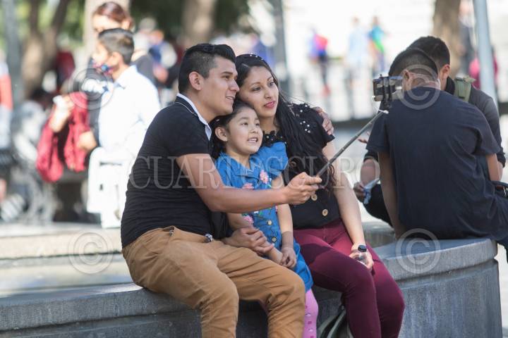 Una familia se toma una foto en la Alameda Central. Las autoridades sanitarias han llamado a ser más rigurosos con las medidas sanitarias, como el uso de cubrebocas, por que la ciudad está en alerta por el alza de casos de Covid-19.