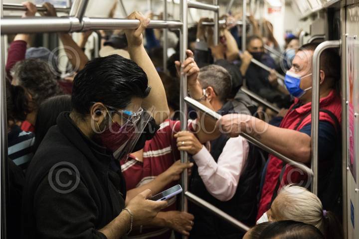 Un joven con cubrebocas y careta mira su celular en el metro, autoridades capitalinas anunciaron que la ciudad regresa a semáforo naranja de la alerta epidemiológica por el Covid-19.