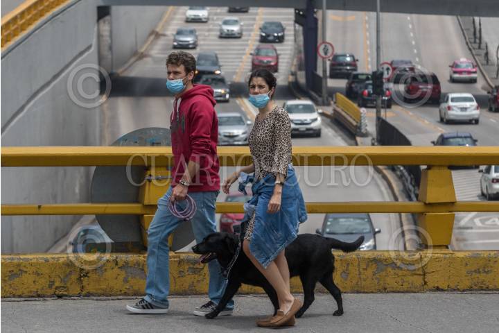 Una pareja con cubrebocas pasea con su perro en avenida Reforma, esta semana la capital avanza a semáforo amarillo de la alerta epidemiológica por el Covid-19.