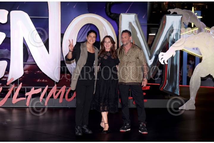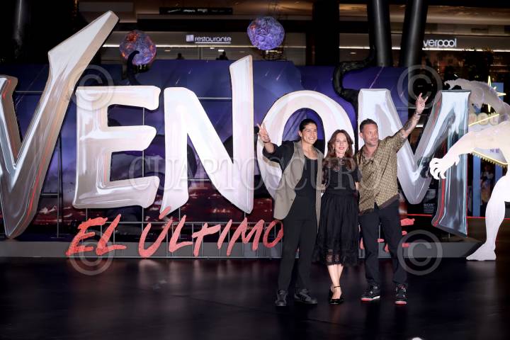 NAUCALPAN, ESTADO DE MÉXICO, 15OCTUBRE2024. El actor mexicano, Cristo Fernández; la directora Kelly Marcel y Tom Hardy llegan al evento para fans, promocionando la nueva película “Venom, el último baile”. FOTO: EDGAR NEGRETE LIRA/CUARTOSCURO.COM