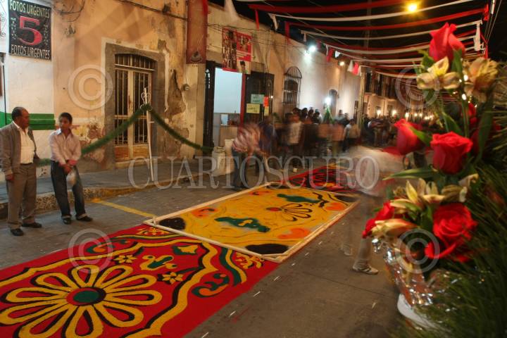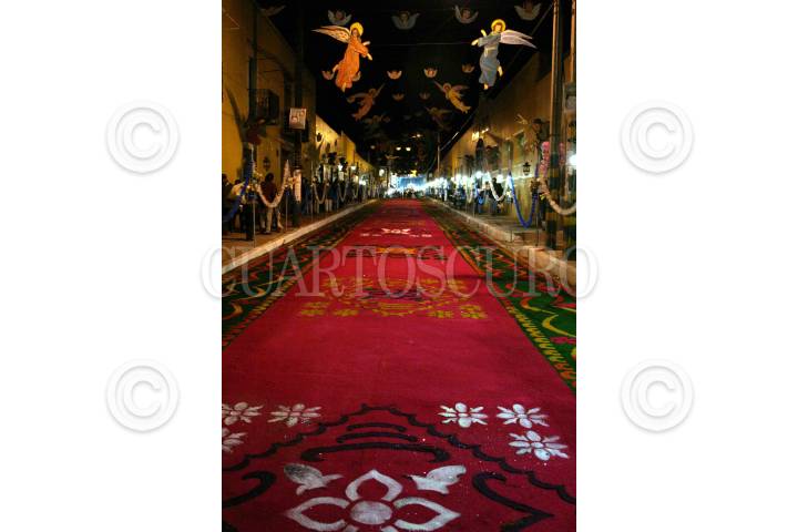 Huamantla, Tlaxcala, 15AGOSTO2004.- Con una procesión que dura toda la noche, los pobladores de Huamantla celebran el día de la virgen de Santa María de la Caridad. Como ofrenda adornan las calles por la que pasa la imagen con alfombras con distintos motivos de la naturaleza o geometricos. FOTO: Moisés Pablo/CUARTOSCURO.COM