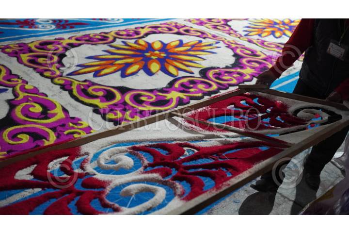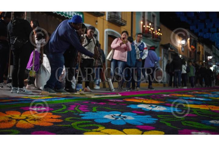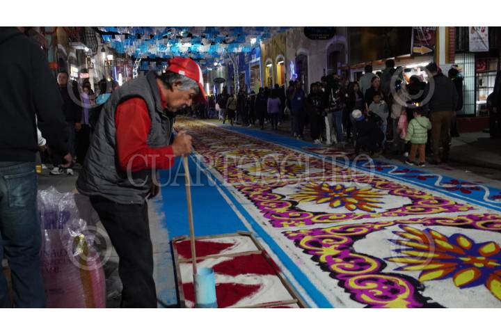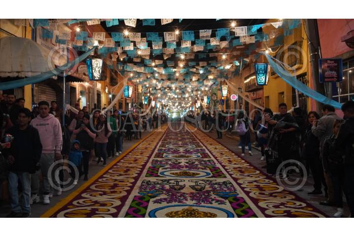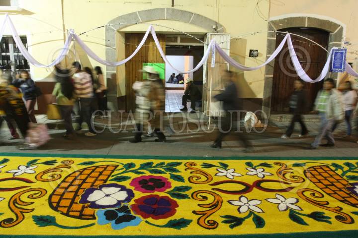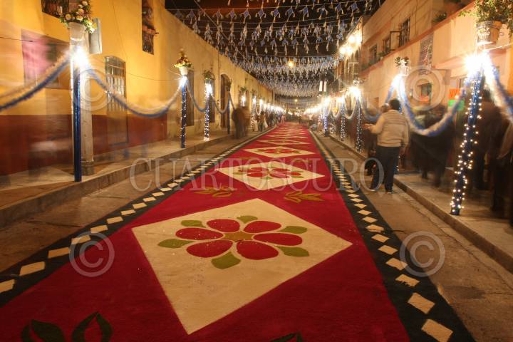 HUAMANTLA, TLAXCALA, 15AGOSTO2011.- Durante la noche se pudieron apreciar distintas alfombras y tapetes de aserrín y arena coloreada que se realizaron con motivo de la fiesta de Nuestra Señora de la Caridad. Las alfombras que son mundialmente famosas, son realizadas por los lugareños y llegan a extenderse por mas de 12 kilómetros por diversas calles de esta ciudad ubicada en la zona oriente del estado. FOTO: J GUADALUPE PEREZ/CUARTOSCURO.COM