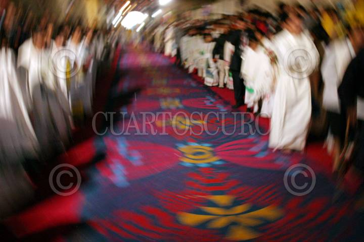 Huamantla, Tlaxcala, 15AGOSTO2004.- Conocida como la "Noche que Nadie Duerme", las celebraciones de la virgen de Santa María de la Caridad duran toda la noche, la procesión visita todas las calles del barrio que han sido ataviadas de alfombras con diverso motiovos. FOTO: Moisés Pablo/CUARTOSCURO.COM