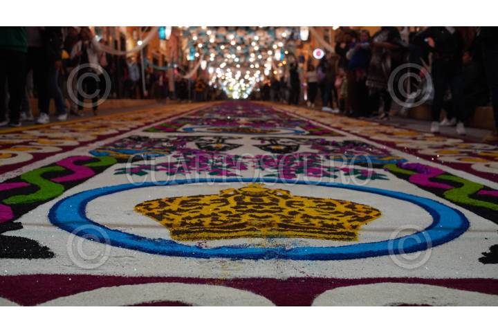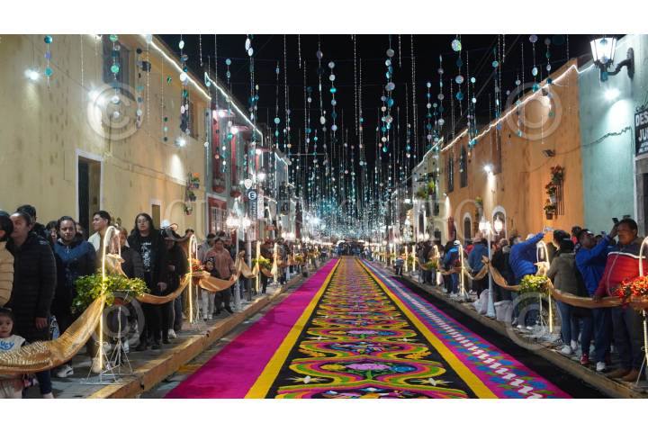 HUAMANTLA, TLAXCALA, 15AGOSTO2024.- Miles de turistas y feligreses asistieron a la edición 50 de la tradicional "Noche que nadie duerme", una velada en la que maestros alfombristas realizan más de 10 km de su arte efímero. Los tapetes de aserrín multicolor y con diseños cada vez más elaborados son ofrendados para dar paso a la virgen de La Caridad, patrona de Huamantla. FOTO: ALAÍN HERNÁNDEZ/CUARTOSCURO.COM