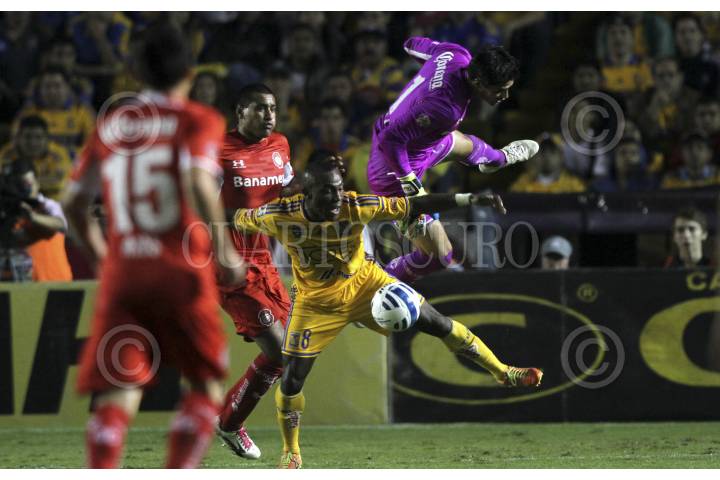 SAN NICOLAS DE LOS GARZA, NUEVO LEÓN, 22NOVIEMBRE2014.- Joffre Guarron del equipo de los Tigres de la UANL se disputa el balón con Alfredo Talavera portero del equipo del Toluca, en el estadio Universitario, partido correspondiente a la jornada 17 de la Liga MX, Apertura 2014. FOTO: GABRIELA PEREZ MONTIEL / CUARTOSCURO.COM