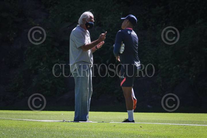 Miguel Mejía Barón, durante charla con el entrenador de porteros de los Pumas.