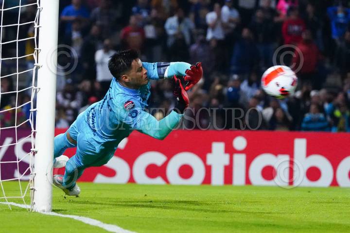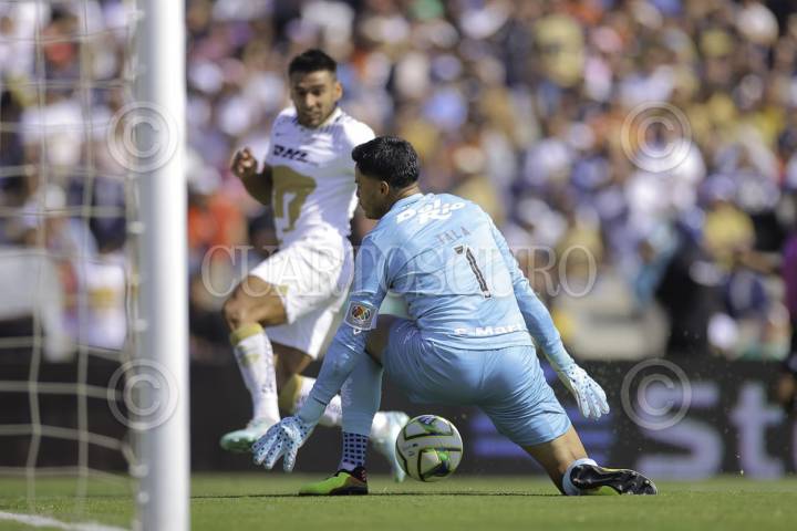 Alfredo Talavera (FC Juárez) nada puede hacer ante el disparo de Eduardo Salvio (Pumas), con este gol los universitarios empataban el encuentro 1-1.