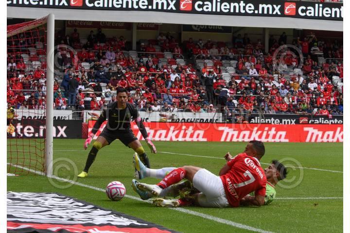 Alfredo Talavera portero de Bravos de Juárez, Brian Garcia defensa de los Diablos de Toluca durante el encuentro de la jornada 16 en el estadio Nemesio Diez.