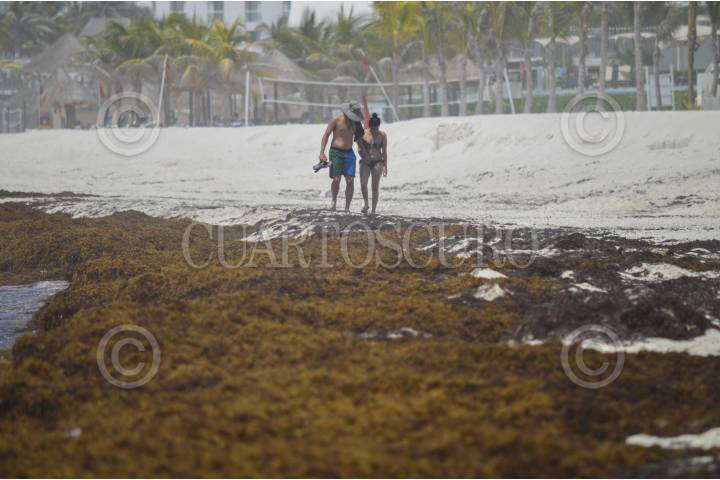 Turistas caminan por una de las playas de Cancún a pesar de la presencia del sargazo.