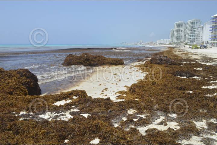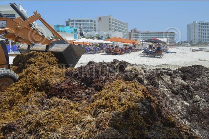 CANCÚN, QROO, 20JULIO2015.- Trabajadores del Ayuntamiento de Cancún trabajando para levantar el exceso de sargazo en las costas de Quintana Roo no es un problema sólo de México sino de todo el Caribe. Desde Galveston, la comitiva de la Asociación de Hoteles y funcionarios de la Zona Federal Marítimo Terrestre (Zofemat), confirmaron que todos los destinos vacacionales de la zona tienen un problema semejante. FOTO: ELIZABETH RUIZ /CUARTOSCURO.COM