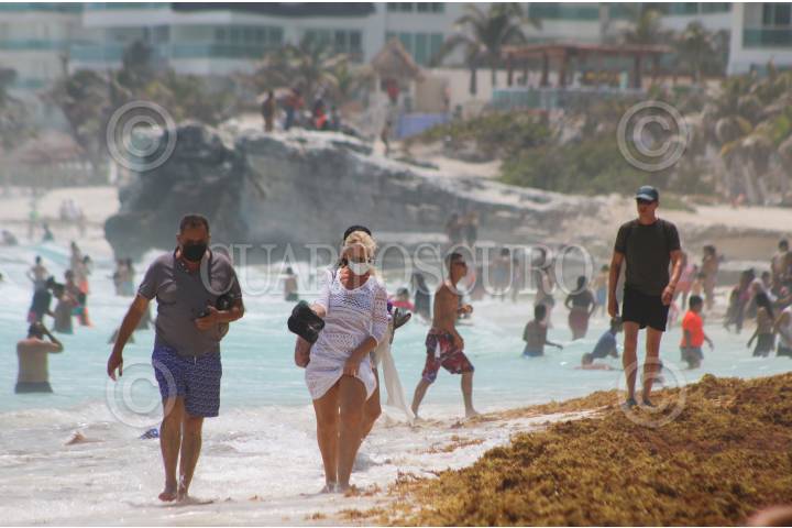 La presencia del sargazo no evita que decenas de turistas visiten las playas del Caribe mexicano.