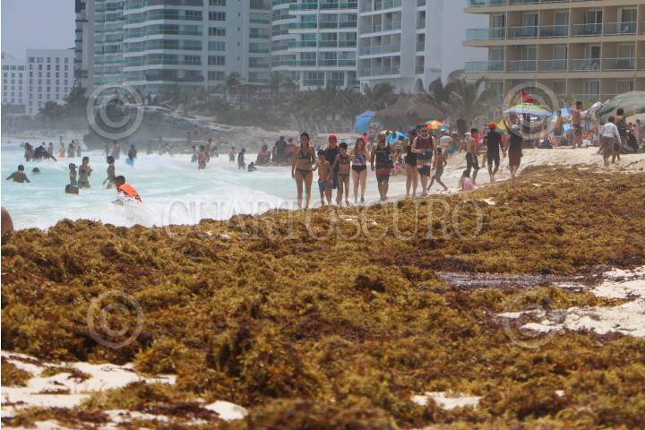 CANCÚN, QUINTANA ROO, 29JULIO2015.- A pesar de la acumulación el sargazo en las costas, turistas vacacionan en las playas de Cancún y la Riviera Maya. Trabajadores laboran el retiro de las algas, aunque este fenómeno no haya afectado la llegada de visitantes. FOTO: ELIZABETH RUIZ /CUARTOSCURO.COM