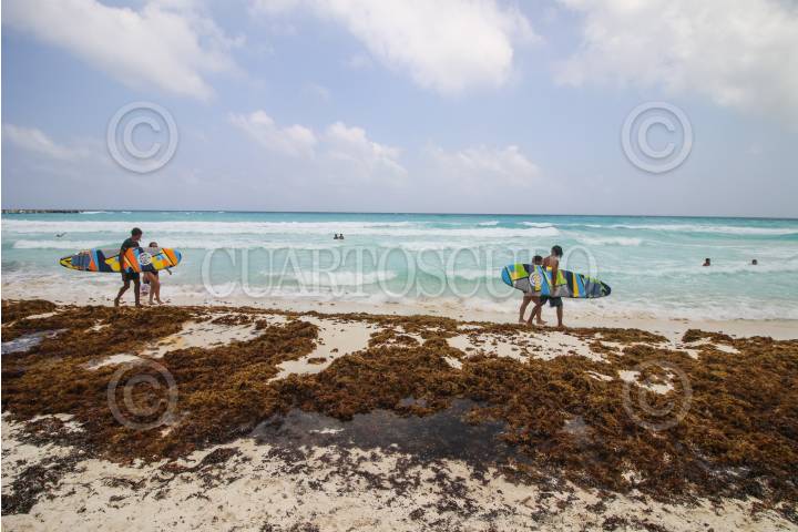 Surfistas se disponen a entrar al mar para practicar este deporte, a pesar de que en las playas se note la presencia del sargazo.