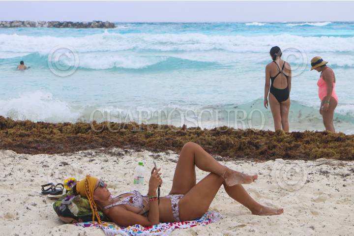 Una turista reposa en una de las playas de Cancún, a un costado grandes cantidades de sargazo se encuentran al borde de las playas.