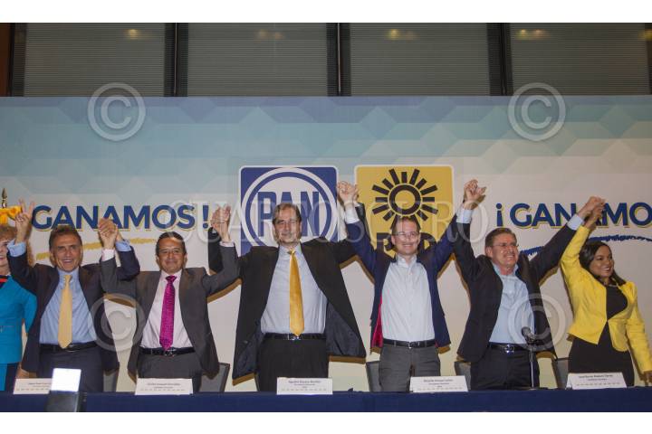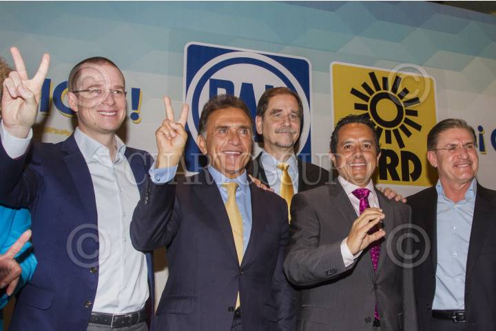 CIUDAD DE MÉXICO, 07JUNIO2016.- Los candidatos de la Alianza PAN-PRD, Miguel Ángel Yunes Linares, Carlos Joaquín González, y José Rosas Aispuro, virtuales ganadores de las gubernaturas de Veracruz, Quintana Roo y Durango, así como Agustín Basave y Ricardo Anaya Cortés, líderes del Sol Azteca y el Blanquiazul, respectivamente, durante la conferencia de los líderes de dichos partidos para hablar de los resultados de la jornada electoral pasada, en la que participaron en alianza y resultaron triunfadores en dichos estados. FOTO: ISAAC ESQUIVEL /CUARTOSCURO.COM
