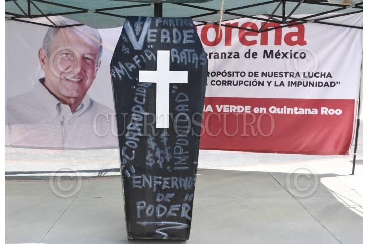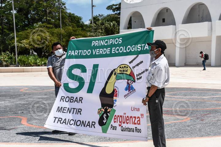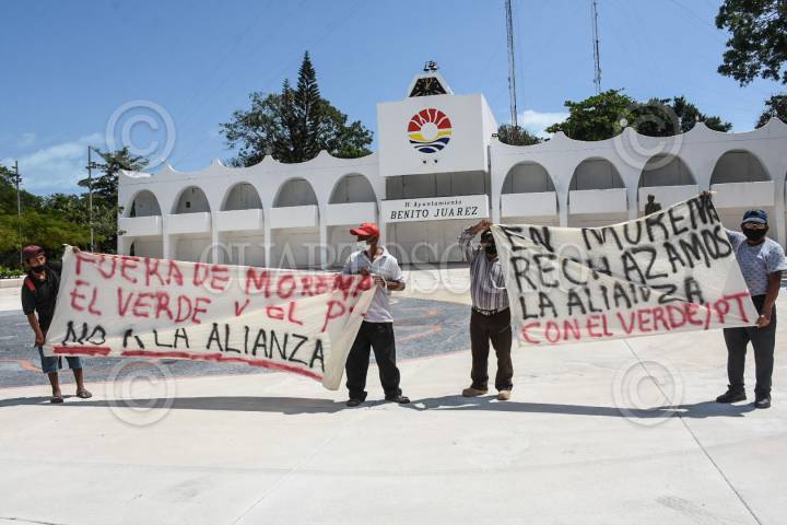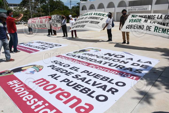 Militantes de Morena protestaron por la alianza electoral que este partido realizó con el Partido Verde Ecologista de México (PVEM), ya que señalan a esta organización política de no cumplir con principios de de no robar y no mentir.