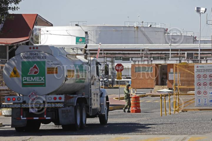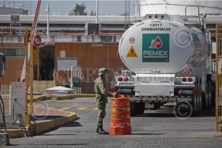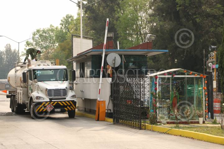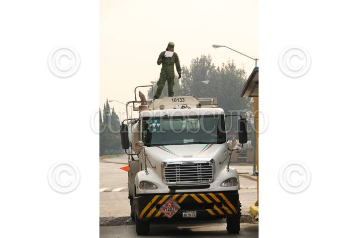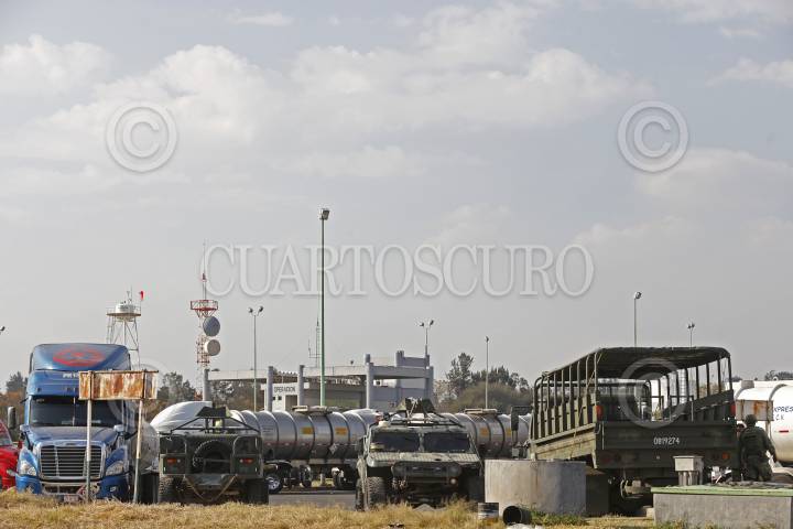 CIUDAD DE MÉXICO, 17ENERO2019.- En la terminal de abastecimiento y almacenamiento de Pemex, ubicada en la alcaldía de Azcapotzalco, desde las primeras horas del día se puede ver un movimiento constante de pipas cargadas de combustible, las cuales son las encargado de abastecer a las gasolineras de toda la Ciudad de México. Lo cual ha permitido disminuir la espera y acortar las largas filas que se habían generado debido a las compras de pánico. En la puerta con el número 3 se puede observar a elementos del Ejercito Mexicano verificando los carros salientes, así como, el contenido de los mismos. FOTO: ROGELIO MORALES /CUARTOSCURO.COM