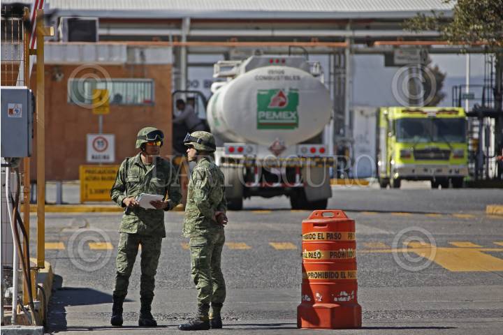 ZAPOPAN, JALISCO, 08ENERO2019.- Personal de Secretaria de la Defensa Nacional (SEDENA), resguardan las instalaciones de la Planta de Almacenamiento 630-TAD ZAPOPAN ubicada en la colonia San Juan de Ocotan de mencionado municipio metropolitano.. FOTO: FERNANDO CARRANZA GARCIA / CUARTOSCURO.COM