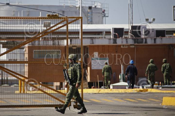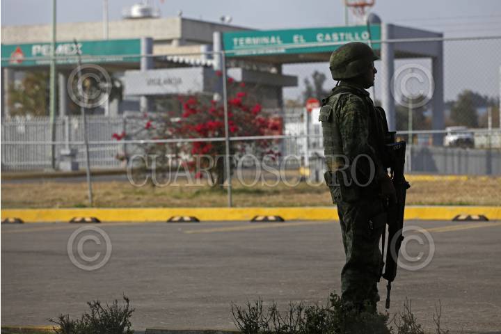 EL SALTO, JALISCO, 10ENERO2019.- Personal de Secretaria de la Defensa Nacional (SEDENA), resguardan las instalaciones de la Planta de Almacenamiento y Reparto TAD El Castillo ubicada en ya mencionado municipio metropolitano. FOTO: FERNANDO CARRANZA GARCIA / CUARTOSCURO.COM