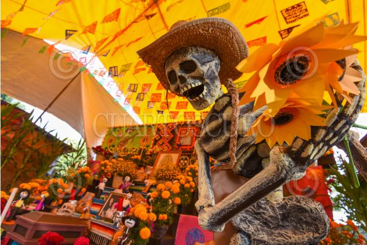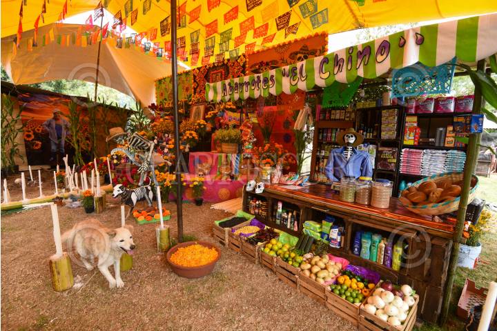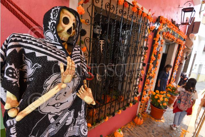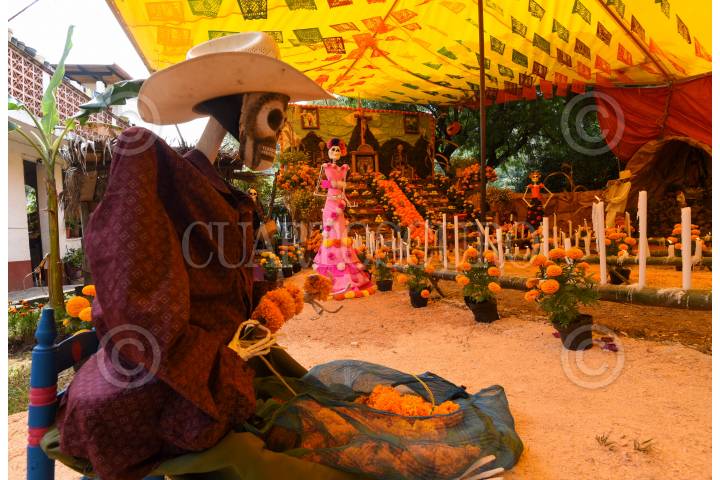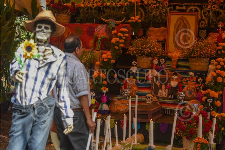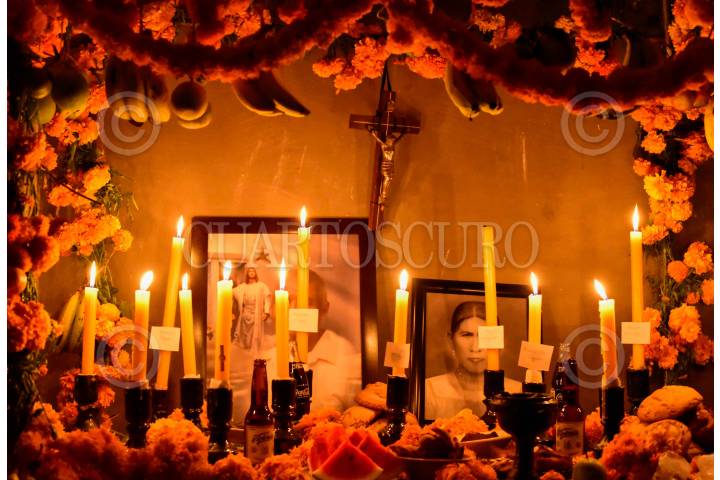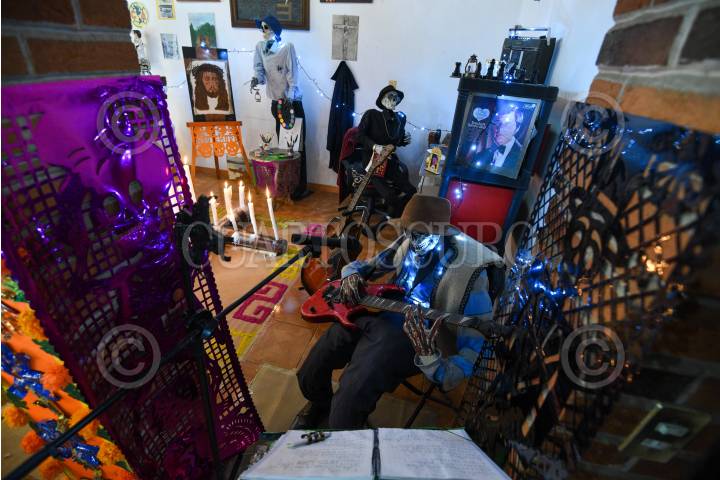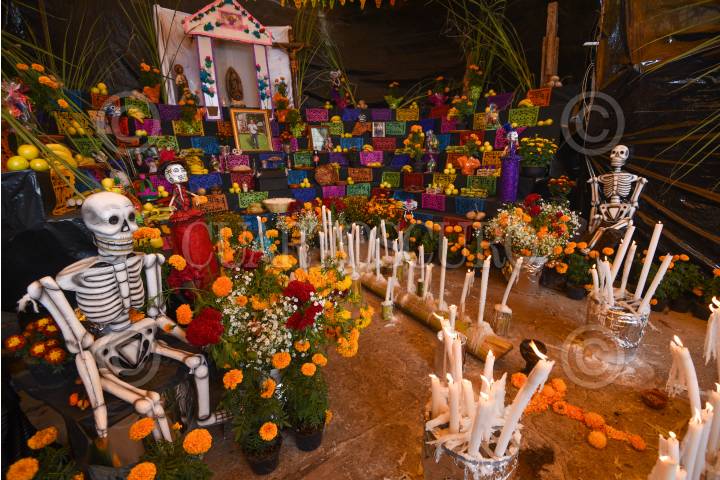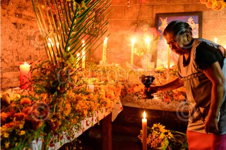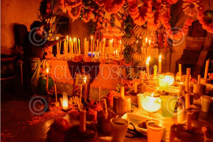 MALINALCO, ESTADO DE MÉXICO, 01NOVIEMBRE2024.- Con ofrendas coloridas y monumentales es como se celebra a los Nuevos Difuntos en Malinalco, los hogares abren sus puertas desde el 28 de octubre hasta el 2 de noviembre a visitantes, en los altares se recrea la vida del fallecido, todos sus gustos y aficiones, en la elaboración las familias llegan a tardarse cerca de 2 meses. Aquellos que visitan las ofrendas llevan una cera o veladora al fallecido lo que representa una luz en su camino y a cambio la familia ofrece dulces, tamales, fruta, pan, ponche, agua o mezcal.FOTO: CRISANTA ESPINOSA AGUILAR /CUARTOSCURO.COM