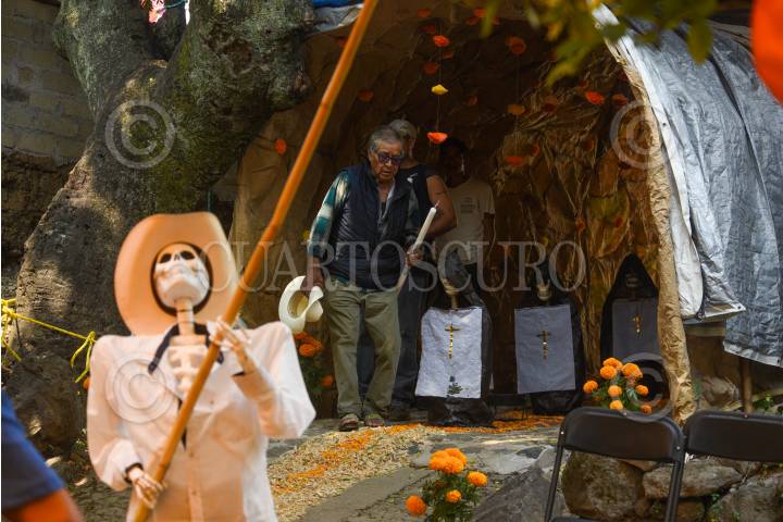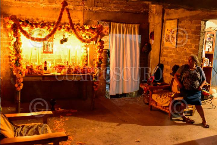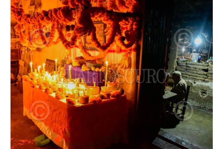 IXCATEOPAN, GUERRERO, 01NOVIEMBRE2024.- Adultos mayores de la comunidad de Ixcateopan en la Montaña de Guerrero conservan la tradición de colocar las ofrendas de Día de Muertos. Los altares están realizados por arcos de palma, flores de cempasúchil, flor de tetkalla (flor de muerto), veladoras (una por cada persona fallecida), alimentos y bebidas que al difunto les gustaban en vida como: mole, pan, agua, refrescos, cerveza y mezcal. Las almas de los difuntos se reciben al medio día, cuando son tocadas las campanas de la iglesia para anunciar la llegada y se velan durante toda la noche, los días 1 y 2 de noviembre. FOTO: CARLOS CARBAJAL/CUARTOSCURO.COM