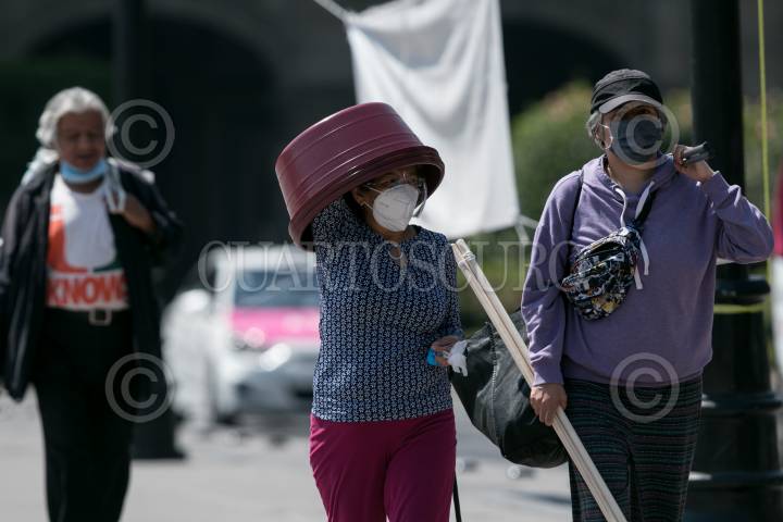 Una mujer sse cubre del sol con una cubeta mientras reccore la plancha del zócalo.