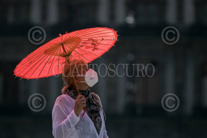Una mujer se resguarda del sol con su paraguas en la plancha del Zócalo.