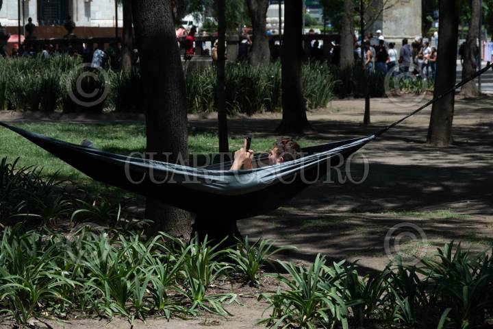 Un hombre instaló una hamaca en las inmediaciones de la Alameda Central para descansar y cubrirse algo del sol.