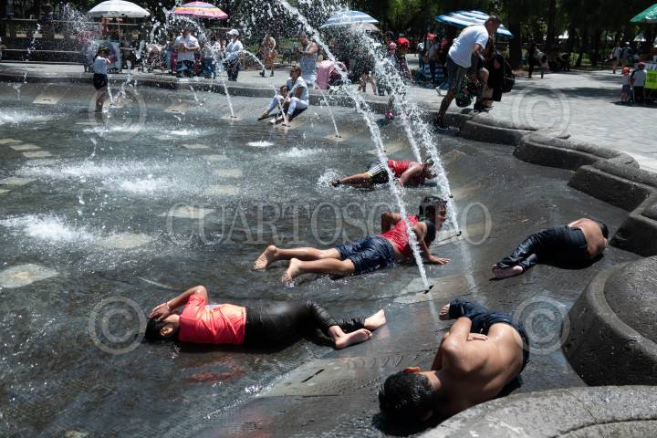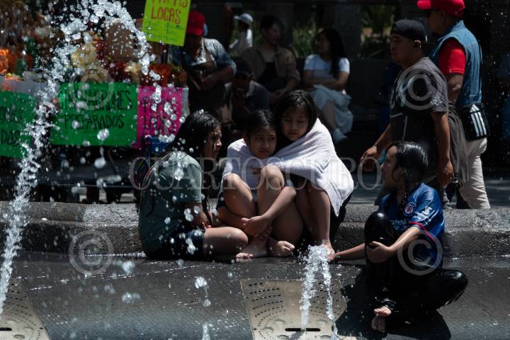 Familias se refrescan en las fuentes de la Alameda Central debido a las altas temperaturas registradas en la zona centro.