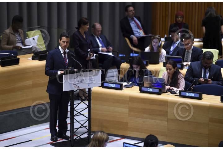NUEVA YORK, ESTADOS UNIDOS, 19SEPTIEMBRE2016.- El Presidente Enrique Peña Nieto participó hoy en la Sesión Plenaria de la Reunión de Alto Nivel, para atender grandes movimientos de migrantes y refugiados del 71º Periodo de Sesiones de la Asamblea General de la Organización de las Naciones Unidas. En la misma, aseguró que “México seguirá trabajando para que se reconozca a los migrantes como agentes de cambio y desarrollo, para que se garanticen sus derechos humanos y se destierren los discursos de odio y discriminación en su contra”. FOTO: PRESIDENCIA /CUARTOSCURO.COM