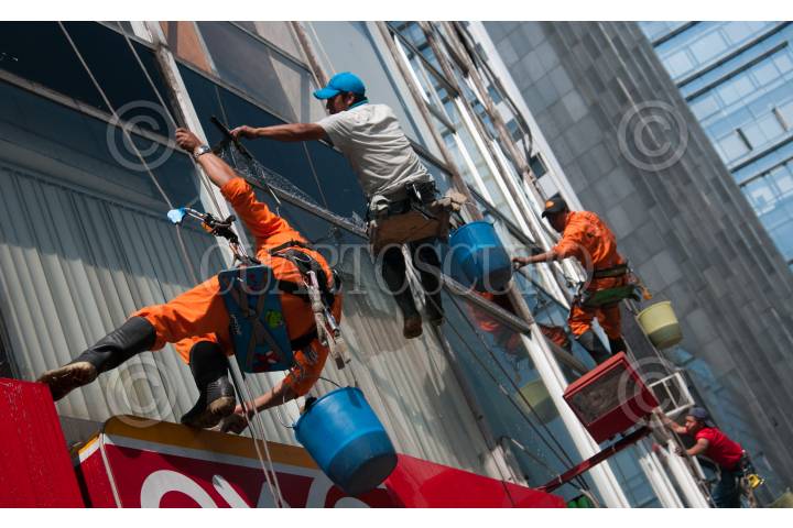 MÉXICO, D.F., 29DICIEMBRE2014.- Trabajo de altura. Colgados con arneses, cuatro trabajadores limpian los vidrios de un edificio sobre Paseo de la Reforma. FOTO: DIEGO SIMÓN SÁNCHEZ /CUARTOSCURO.COM