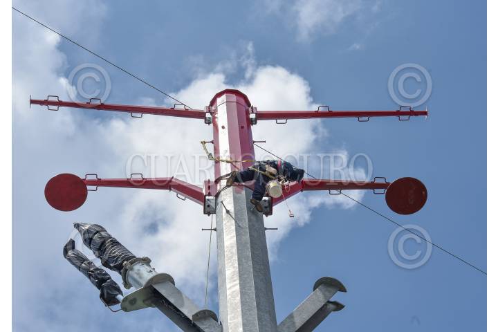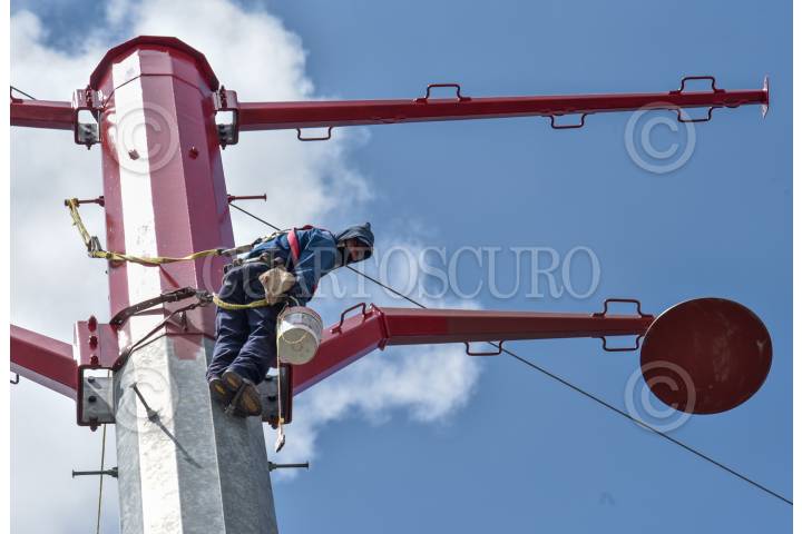 Un hombre trabaja en la parte más alta de una torre de luz en Toluca.