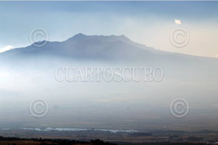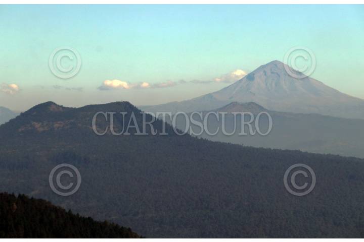 Panorámica de los volcanes desde el Bosque de Agua, en la frontera de el Estado de México, Morelos y la Ciudad de México.