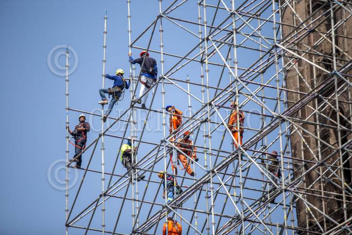 MÉXICO, D.F., 13MARZO2015.- Dos trabajadores hacen maniobras parados en una estructura metálica de la Torre Reforma, sobre Paseo de la Reforma. FOTO: DIEGO SIMÓN SÁNCHEZ /CUARTOSCURO.COM