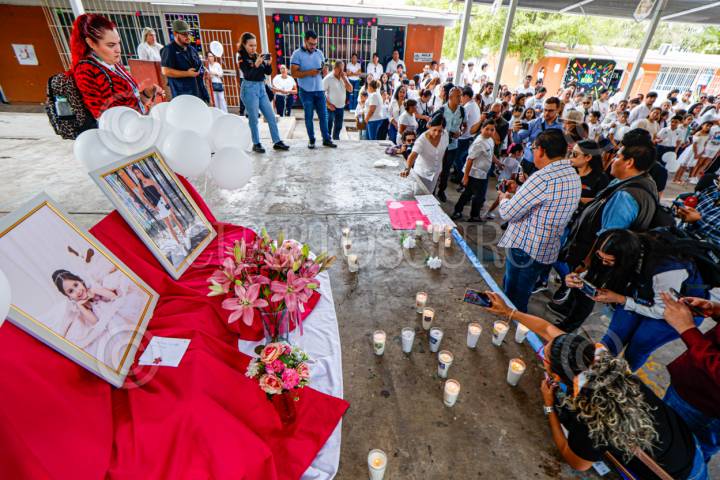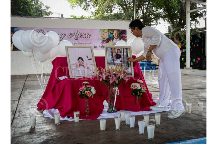CULIACÁN, SINALOA, 12MAYO2025.- En un emotivo homenaje, maestros, alumnos y padres de familia recordaron a Alexa y Leydi, las dos niñas de 7 y 11 años cuya vida fue arrebatada en Badiraguato mientras disfrutaban del ‘puente’ escolar. En la plaza cívica de la Escuela Primaria, se montó un altar con sus fotografías, rodeado de flores y veladoras, donde sus compañeros dejaron ofrendas y cartas como despedida. Tras los honores a la bandera, sus maestras, María del Socorro Cárdenas y Paola Román Contreras, compartieron una breve semblanza de ambas, destacando su alegría, compromiso con sus estudios y el cariño que irradiaban en cada rincón del aula. Como muestra de indignación y exigencia de justicia, familiares, docentes y alumnos se manifestaron al exterior del plantel, bloqueando el boulevard Enrique Cabrera, exigiendo respuestas y medidas ante la tragedia que ha sacudido a la comunidad. FOTO: JOSÉ BETANZOS ZÁRATE/CUARTOSCURO.COM