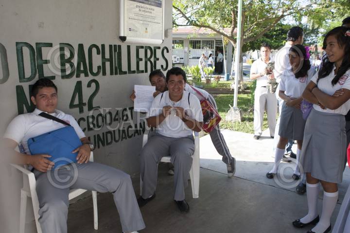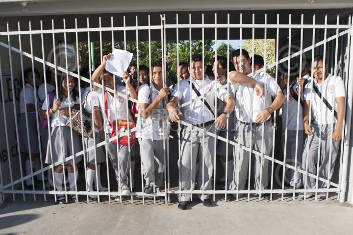 CUNDUACAN, TABASCO, 30ENERO2013.- Un paro de labores a brazos caídos por parte de los profesores del plantel 42 del Colegio de Bachilleres, ubicado en la ranchería Cucuyulapa, provoca que al menos 270 alumnos queden privados de su libertad y bajo cadenas en esta institución educativa. Lo anterior se debe a que la directora Maricruz Carrillo Graniel ha sobre pasado el limite con insultos anti sonantes e intimidar a los escolares; y tal es el repudio de los estudiantes que llegaron a crear un blog en el facebook titulado "No a la peloz de elotez", en la cual los jóvenes tiranizan en forma de venganza la actitud de la docente. Así mismo, se pudo observar que varios escolares en un acto de desesperación por sentirse privados de su libertad, se escapan al brincarse la barda. FOTO: MARCO POLO GUZMÁN HERNÁNDEZ /CUARTOSCURO.COM