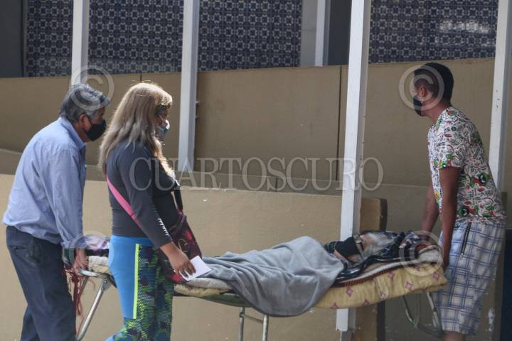 Dos mujeres trasladan a una persona en silla de ruedas en la periferia del Hospital Regional N2.