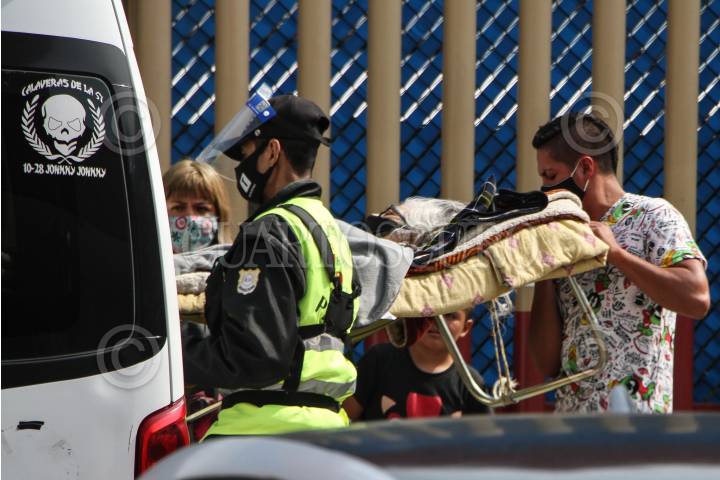 Familiares y personal médico ayudan a una mujer de la tercera edad a ingresar al Hospital Regional N2.